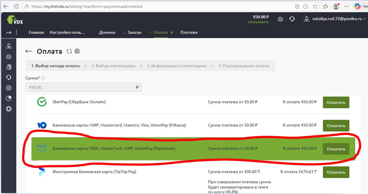 На этом этапе необходимо выбрать удобный способ оплаты услуг хостинга и сервера.